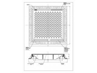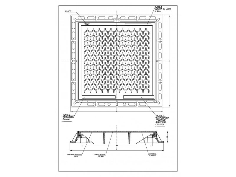 Kvadratni kanalizacijski poklopci,Art. 208, nazivne mjere 600x600,sa elastičnim umetkom i samozaključavanjem, izrađeni su od nodularnog lijeva sukladno normi EN 124, nosivosti 400 KN, predviđeni za ugradnju na prometne površine prema propisima norme EN 124 i nosivosti. Gornja-vidljiva strana poklopca je izvedena sukladno gore navedenoj normi sa odgovarajućom ornamentikom, a može prema zahtjevu kupca biti izvedena sa natpisom, npr. KANALIZACIJA, VODOVOD, ELEKTRIKA, TELEFON, GRIJANJE, zatim mogu biti odljeveni eventualno grb ili znak grada ili naziv tvrtke kupca