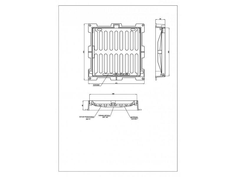 Kvadratna kanalska rešetka, sa otvaranjem na šarnir(pant), sa samozaključavanjem, koristi se za „točkasto“ prikupljanje oborinskih voda na prometnim površinama, izrađena je od nodularnog lijeva sukladno normi EN 124-2:2015, nosivosti 400 KN, predviđena za ugradnju u prometne površine , prema propisima norme EN 124-2:2015 i tražene nosivosti. Rešetka-gornji profil izveden je ravno čime se osigurava idealna ravnina prometne površine. Samozaključavanjem sa dva zuba rešetka je osigurana od neželjenog otvaranje u eksploataciji.